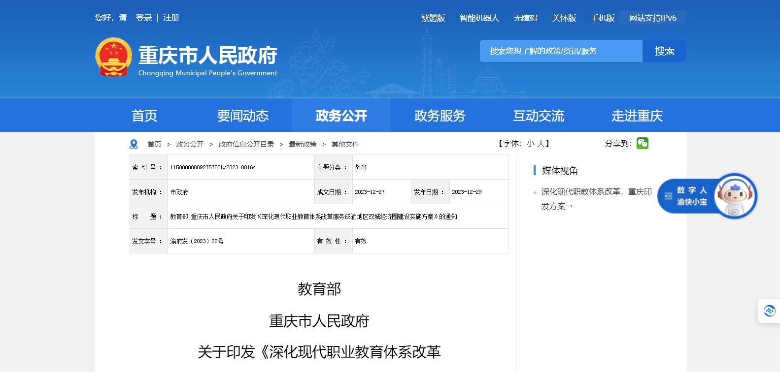 近日,重慶市人民政府官網(wǎng)發(fā)布教育部 重慶市人民政府 關(guān)于印發(fā)《深化現代職業(yè)教育體系改革 服務(wù)成渝地區雙城經(jīng)濟圈建設實(shí)施方案》的通知,通知中明確實(shí)施職業(yè)教育數字化行動(dòng),做大做強重慶智慧教育平臺,建設國家級職業(yè)教育在線(xiàn)精品課程100門(mén)左右、規劃教材300種左右、專(zhuān)業(yè)教學(xué)資源庫10個(gè)左右、虛擬仿真實(shí)訓基地15個(gè)左右。實(shí)施教師能力提升行動(dòng),教育部支持重慶市承辦全國職業(yè)院校技能大賽教學(xué)能力比賽和德育與思想政治教育有關(guān)賽項,建設一批“雙師型”教師培養培訓基地、教師教學(xué)創(chuàng )新團隊、教師企業(yè)實(shí)踐基地和示范性教師企業(yè)實(shí)踐流動(dòng)站,推動(dòng)企業(yè)工程技術(shù)人員、高技能人才和職業(yè)學(xué)校教師雙向流動(dòng)。實(shí)施終身學(xué)習質(zhì)量提升行動(dòng),推進(jìn)成渝地區雙城經(jīng)濟圈學(xué)分銀行建設,開(kāi)展多種形式的職業(yè)教育資格資歷互認,建設一批示范性職工培訓基地,打造一批職業(yè)學(xué)校老年教育、社區教育示范基地。